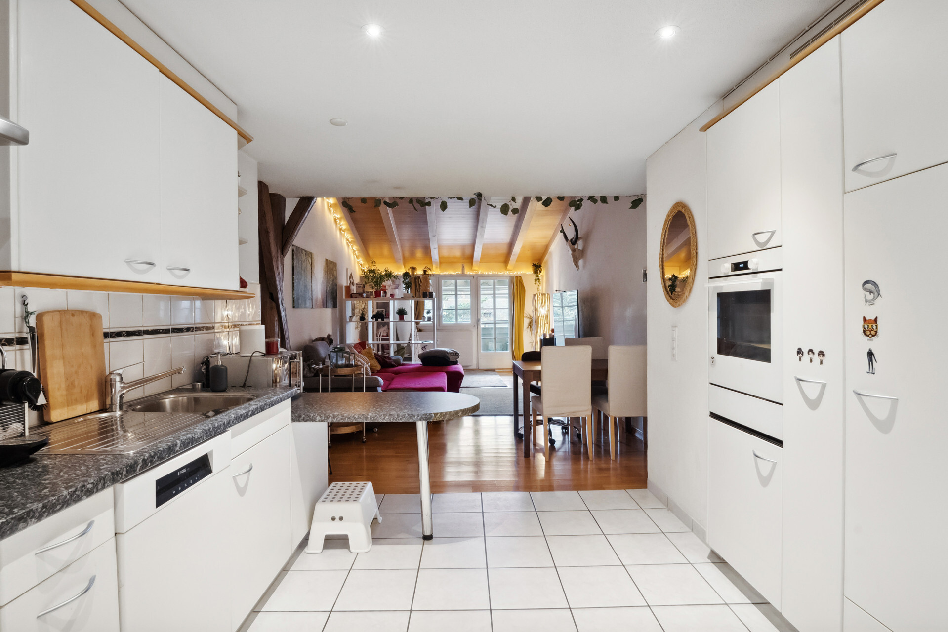 Mitten in der Thuner Altstadt können sich Liebhaber und Investoren mit Sinn für Historisches jetzt ein besonderes Schmuckstück sichern. Zwischen der Oberen Hauptgasse mit ihren Hochtrottoirs und den liebevoll gestalteten Hausfassaden sowie der prächtigen Promenade am Aarequai macht sich die Hausnummer 44 zwar schmal zwischen den Nachbargebäuden, ist aber deswegen keinesfalls weniger bemerkenswert.Das als Kunstaltertum im Grundbuch eingetragene Gebäude unterliegt der gemischten Nutzung. Im Erdgeschoss mit Schaufenster zur Hauptgasse beherbergt es ein Kleidergeschäft und ein Restaurant-Lager, in den Geschossen darüber drei Mitte der 1990er-Jahre ausgebaute Wohnungen. Das Untergeschoss mit ebenerdigem Ausgang zum Aarequai dient als Lagerraum für das Restaurant im Nebenhaus. Dem Laden sind an dieser Lage viele Kunden sicher; die Bewohner schätzen ihrerseits das einmalige Altstadtair, die Sicht auf die Aare von lauschigen Balkonen sowie die bequeme Nähe zu Gastronomie, Einkaufsmöglichkeiten und Bahnhof.