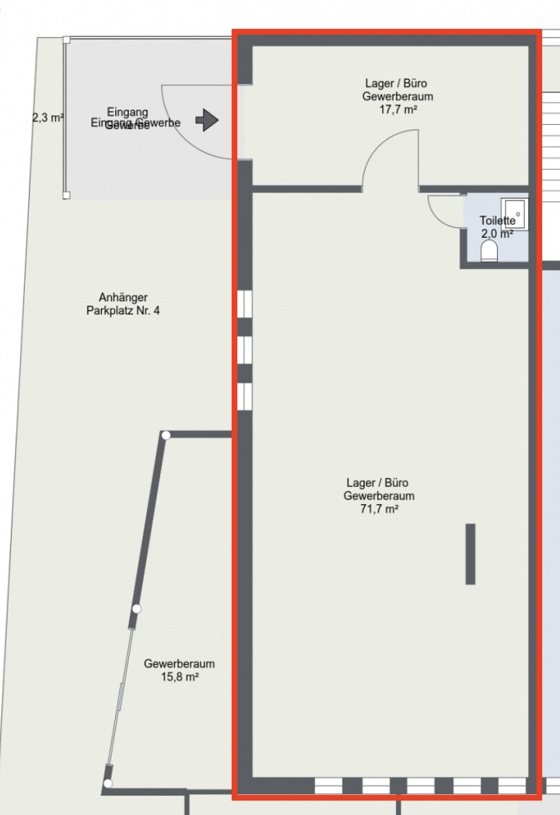 Die 92 m² grosse Fläche im Erdgeschoss eignet sich ideal als Lager, Atelier, Werkstatt, Versandzentrum, Kleinproduktion, Büro mit Showroom oder kombinierte Nutzung. Der grosszügige Grundriss mit zwei abgeschlossenen Zonen (ca. 17.7 m² und 71.7 m²) erlaubt eine flexible Raumaufteilung – auch für Teams oder verschiedene Arbeitsbereiche.